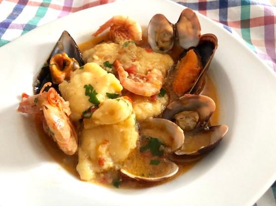 En una cazuela ponemos una cucharada del aceite de sofreir el rape y añadimos la cebolla y el ajo que habremos cortado pequeños para sofrito, dejamos cocer a fuego flojo, cuando la cebola este blanda le añadimos los tomates rallados, salpimentamos y dejamos que se siga haciendo el sofrito, cuando ya esté bien concentrado le ponemos una cucharada de harina, removemos bien dejando que se tueste un poco y a continuación, le añadimos el caldo (que teníamos al fuego hirviendo) ponemos las rodajas de pescado, añadimos la picada y dejamos que cueza a fuego lento unos 10 minutos, seguidamente ponemos los mejillones y almejas que previamente habremos abierto al vapor y las gambas que habremos sofreido un poco antes. Apagamos el fuego y espolvoreamos con perejil picado. Servir bien caliente en plato hondo para ponerle caldito.